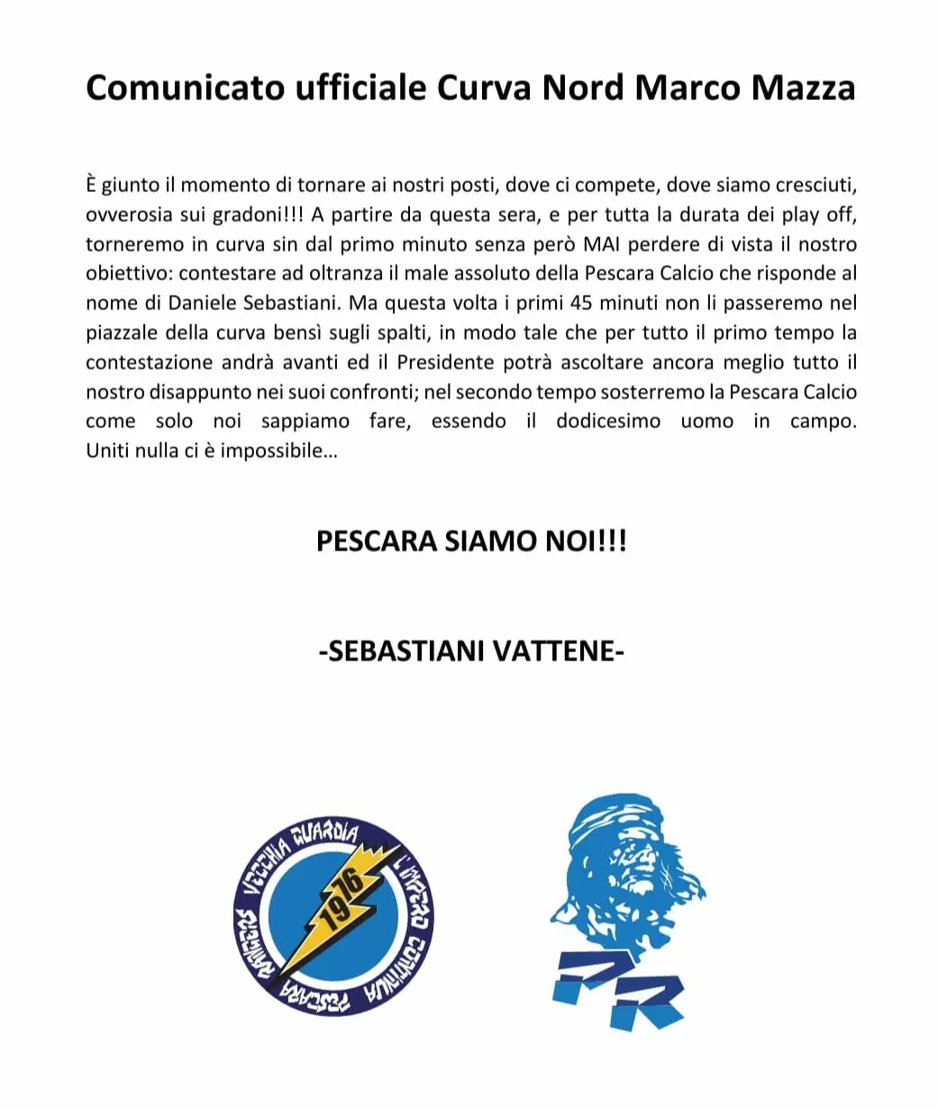 Riceviamo con richiesta di divulgazione e pubblichiamo il comunicato ufficiale Curva Nord Marco Mazza
