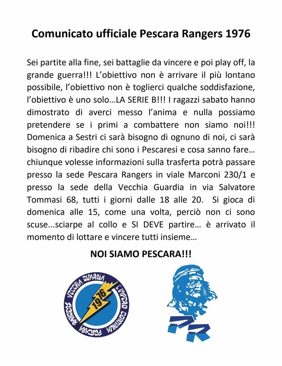 Riceviamo con richiesta di divulgazione e pubblichiamo il comunicato ufficiale Pescara Rangers 1976