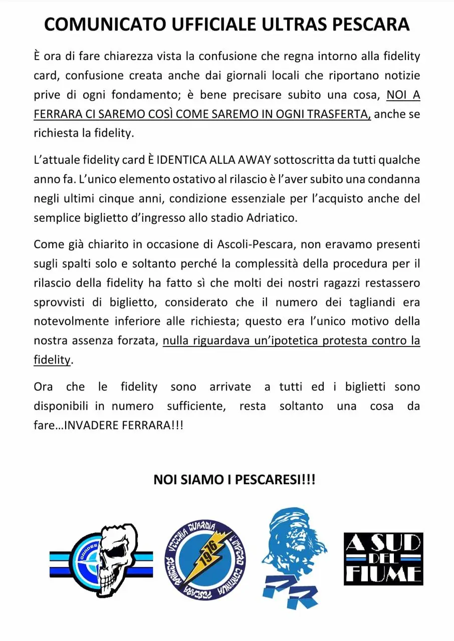 Riceviamo con richiesta di divulgazione e pubblichiamo il comunicato ufficiale Ultras Pescara